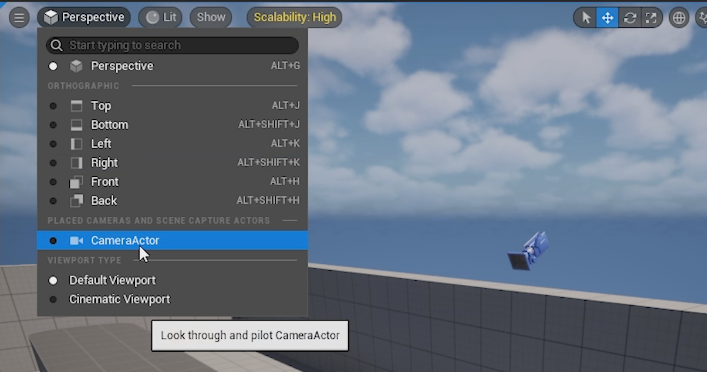 You can also set a specific viewport to use the view of a camera already placed in your level. To do this, choose the viewport you want to change, then click the Perspective dropdown in the top-left corner of that viewport. Under Placed Cameras and Scene Capture Actors, you’ll see a list of all cameras in your level that you can select.