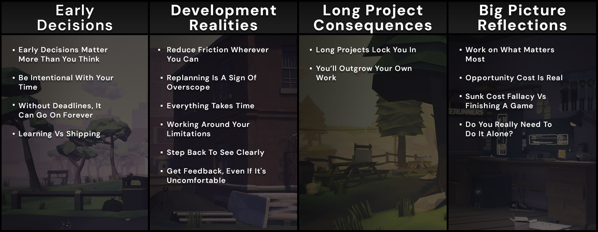 Things like genre, art style, scope, and presentation directly affect how long the game takes to make, how easy it is to market, and whether anyone notices it at all. The problem is, the consequences of these decisions often only show up much later in the project, when they are far harder to change. As a solo dev, you likely won’t have time or support to fix them then.