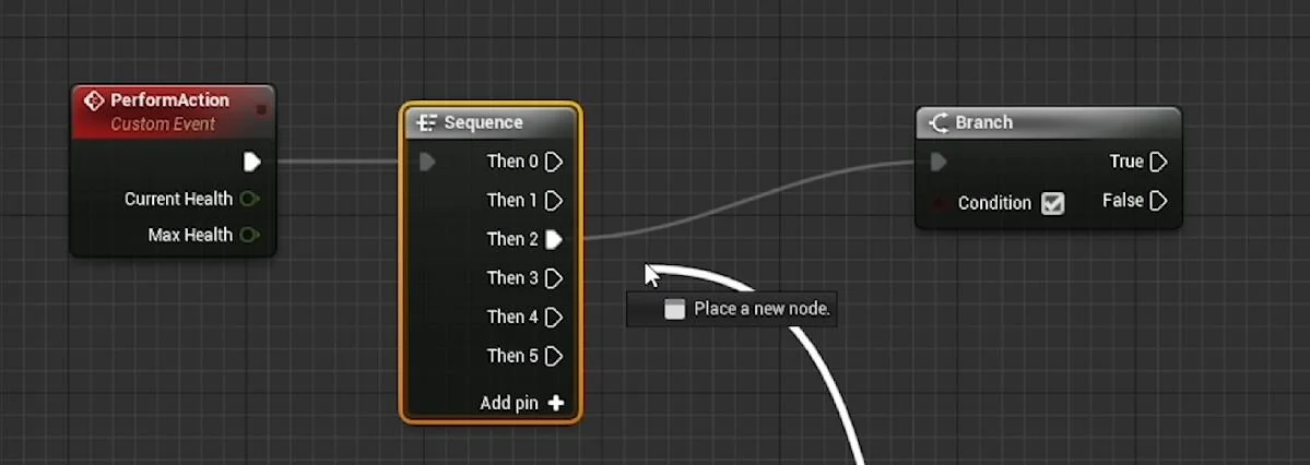 What this is going to do is move your screen to focus on the node which is directly connected to the pin you selected, in this case, the branch in the lower portion of the screen. In this example, it isn’t so useful because you can clearly see and follow the connection line from the sequence to the branch node.